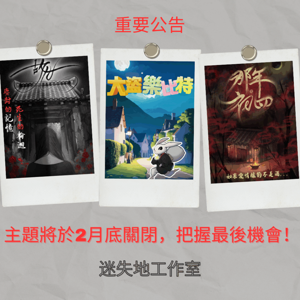 最新消息 天津街場館將於2月底關閉新場館預計4月開幕新場館訊息請密切注意我們的官網,Facebook和Instagram。 密室主題 那年‧初四-介紹&預約此主題將於2026年2月關閉,還沒挑戰的玩家,現在是最後機會! 故世-介紹&預約此主題將於2026年2月關閉,還沒挑戰的玩家,現在是最後機會! 大盜樂比特-介紹&預約此主題將於2026年2月關閉,還沒挑戰的玩家,現在是最後機會! 迷失地工作室 LINE 缐上客服 Facebook客服 地址: 台北市中山區天津街63號6樓電話: (02) 2521-0005 (場館) / 0928388514(如帶場中無法接聽來電, 請聯絡線上客服)電郵: escape.mysterystudio@gmail.com 營業時間:周一至周五:1pm – 10pm周末, 假日:10:00am – 10:00pm 捷運資訊:中山站 (2號出口) – 步行約5分鐘松江南京站 (1號出口) – 步行約10分鐘 公車資訊:南京林森路口 – 步行約4分鐘 (5, 12, 26, 46, 52, 266, 282, 288, 292, 292副, 306, 306區, 307, 605快, 652, 711, 797, 1802, 1802A, 1803, 棕9, 南京幹線, 紅25)中山市場 – 步行約3分鐘 (5, 218, 218直, 220, 中山幹線, 221, 227, 247, 260, 260區, 261, 287, 內湖幹線, 307, 310, 605快, 622, 652, 1717) Facebook Instagram Google Youtube Vimeo